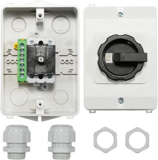 Deze werkschakelaar wordt geleverd met 2 x wartel M25 + moer. 25Ampere 2-polig.