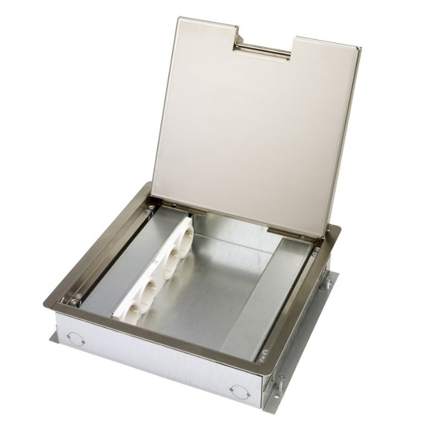 Uitvoering deksel vierkant, Aantal apparaatbekers 0, Materiaal staal, Met sparing vloerbedekking, Diepte vloerbedekkingsuitsparing 15 mm, Beschermkader vloerbedekking, Min. inbouwdiepte 50 mm, Kleur grijs/zilver, Lengte buitenmaat 272 mm, Breedte buitenmaat 273,50 mm, Buitendiameter 0 mm, Lengte inbouwmaat 252 mm, Breedte inbouwmaat 282 mm, Inbouwdiameter 0 mm, Uitvoering afdekplaat met klapdeksel (rvs), Behuizing slagvast, Beschermingsklasse ip20, Samenstelling compleet, Nom. stroom 16 a, Nom. spanning 230 vac, Kleurvariant, Opmerking 4x230v + 4xm45 uitsp. | r, Stekerbaar vlgs NEN61535 n.v.t.